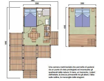 Si tratta quindi di una tenda, sì, ma con i comfort di un bungalow: letti comodi, bagno con doccia, angolo cottura, frigorifero e molto altro. Non una tenda con paletti in ferro o vetroresina, ma una struttura dominata dal legno: il profumo del legno e l’armonia delle forme caratterizzano questo prodotto artigianale unico. Un alloggio che può sembrare essenziale, ma che in realtà offre un buon livello di comfort.